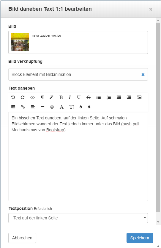Ein Kunde wollte eine kleine Spielerei. Es sollte ein Bild und ein Text gemeinsam in einem Blockelement gepflegt werden können. Das Bild sollte wahlweise entweder links oder rechts zu liegen kommen. Auf schmalen Bildschirmen, wenn das Bild die gesamte Breite des Bildschirms einnimmt sollte immer zuerst das Bild und dann der Text erscheinen.